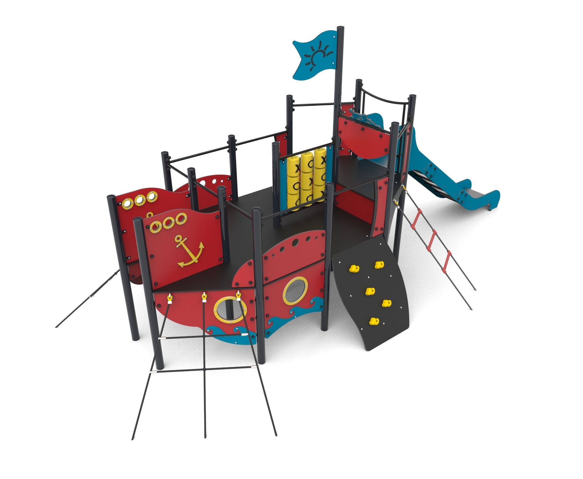 Sjørøverskip til lekeplassen i livlige farger, med klatrevegg, en sklie, bondesjakk, og klatrestiger.